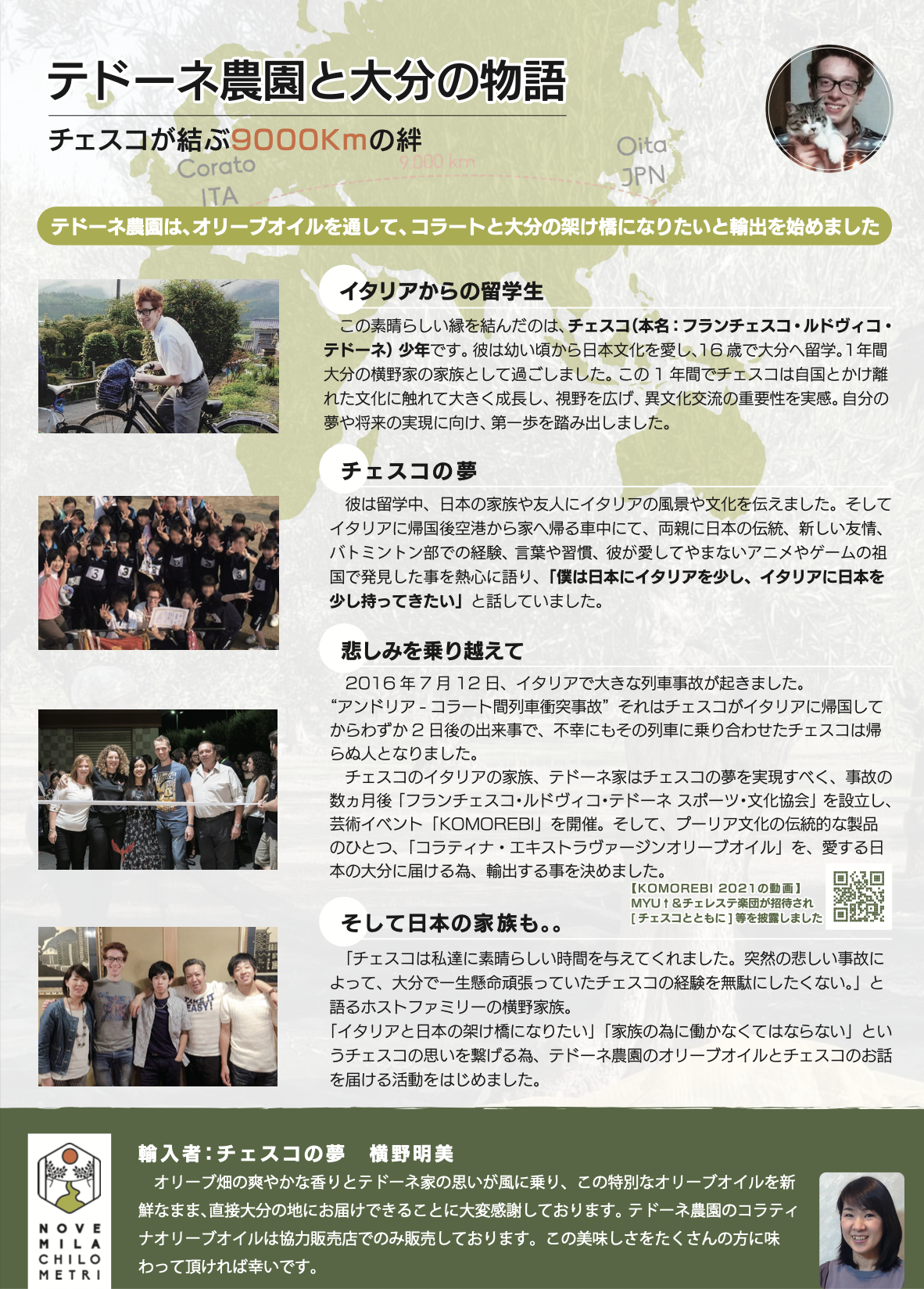 そう、このオリーブオイルはチェスコ君の夢を叶えようと想う日本とイタリアの家族による事業だったのです。